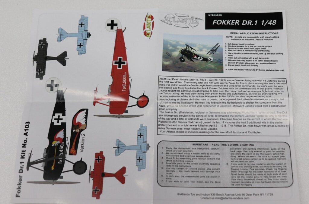 アメリカのアトランティスモデルからリリースされた1/48スケールの第一次大戦機、フォッカーDR.1が入荷しましたのでどんなキットか、中を覗いてみました。