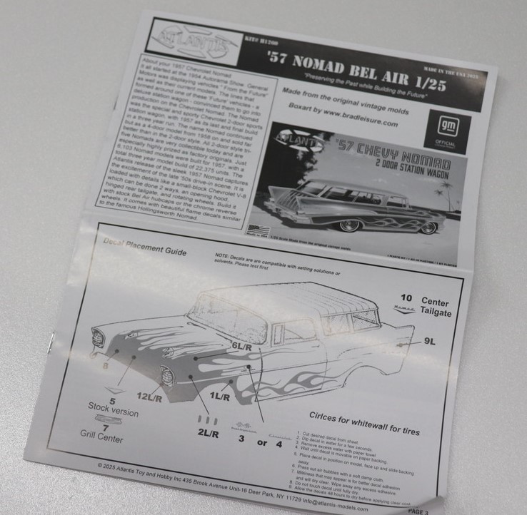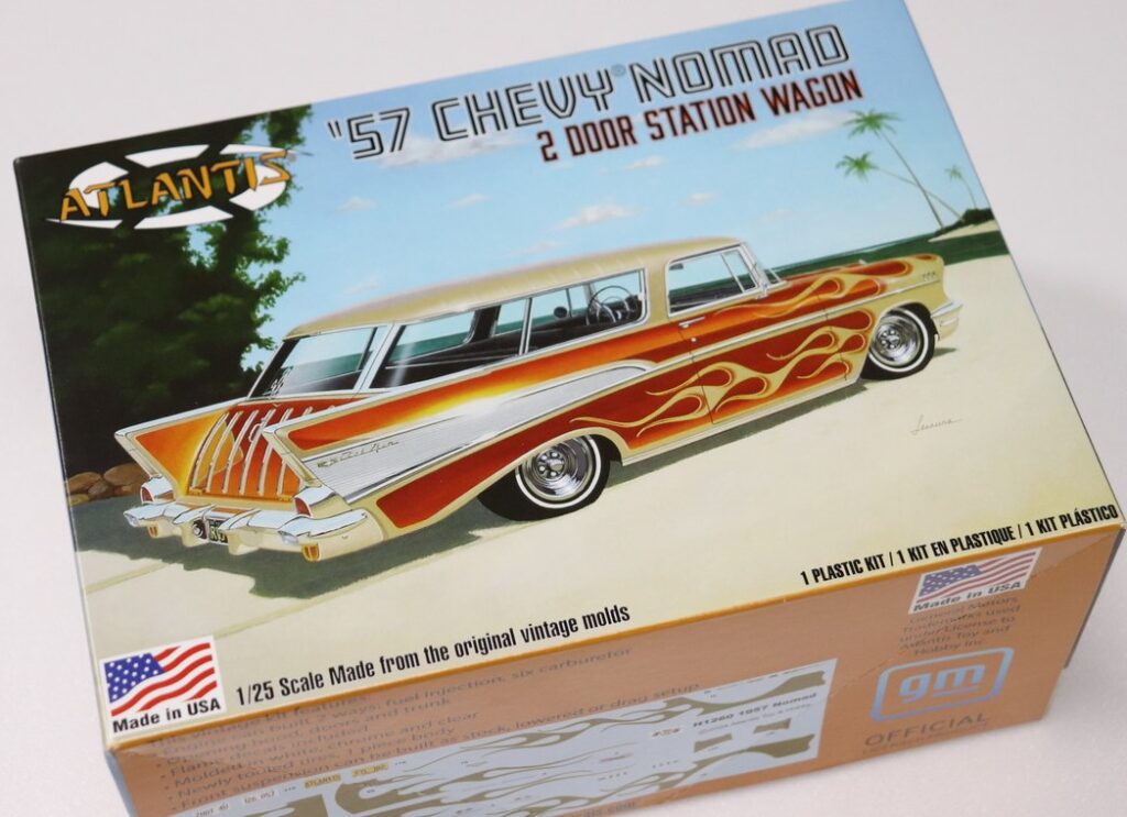 アメリカのアトランティスモデルはアメリカで50年代等に発売されていたオーロラなどのキットを再リリースして人気を集めていますが、今回は1/25のスケールで1957シボレー・ノマドのキットが発売されたので箱の中身を見てみました。