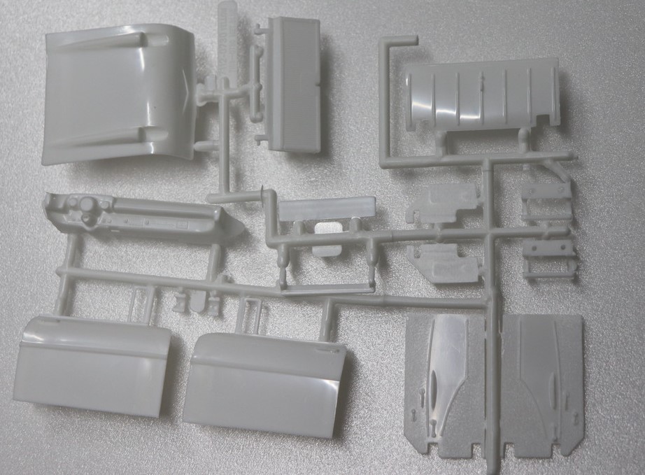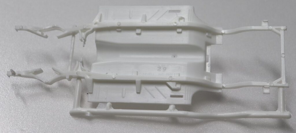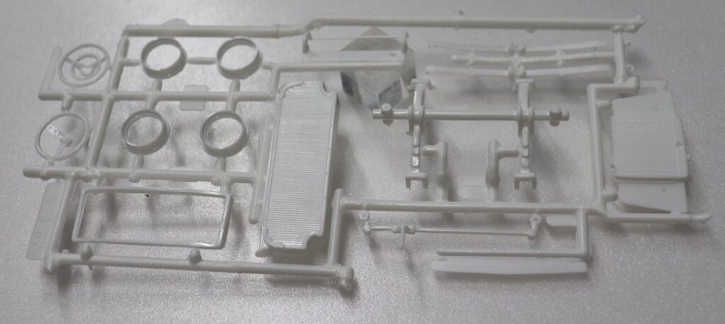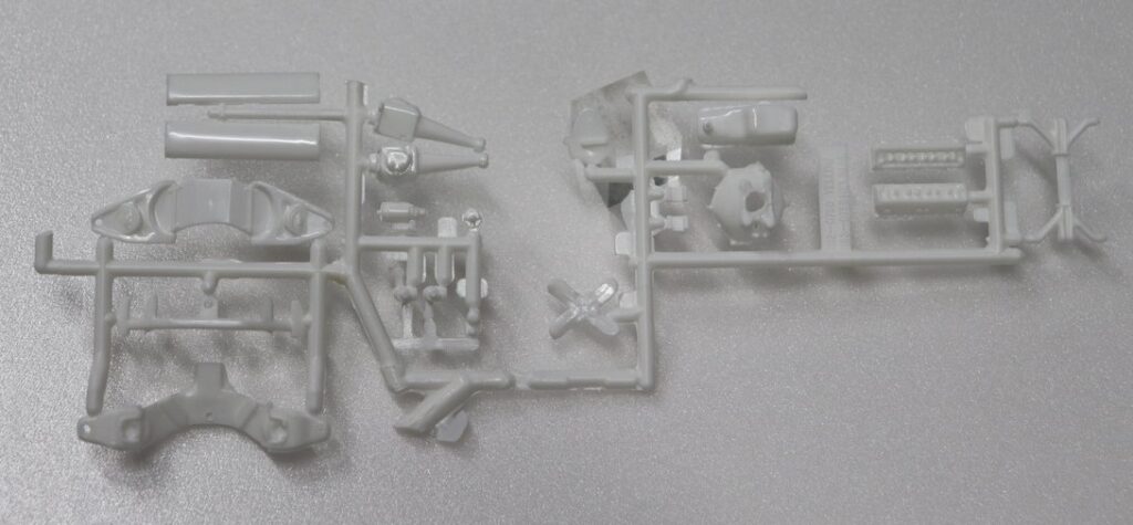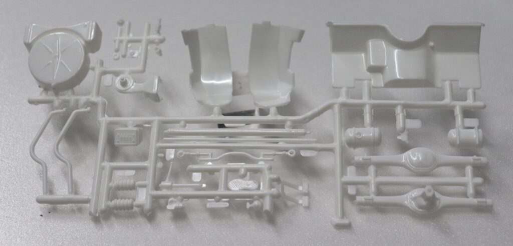 シャーシ関係のパーツなど、どのランナーもパーツが幹を中心に生えている感じ、いわゆる枝ランナータイプ。現代のキットは皆枠の中にパーツがレイアウトされていますから、こんなところにも時代を感じます。